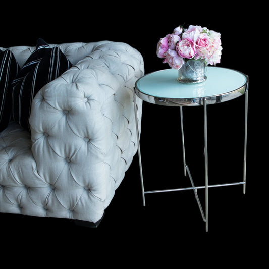 Dilva Polished Stainless Steel Side Table with White Glass Top.