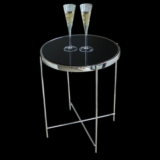 Dilva Polished Stainless Steel Side Table with Black Glass Top.