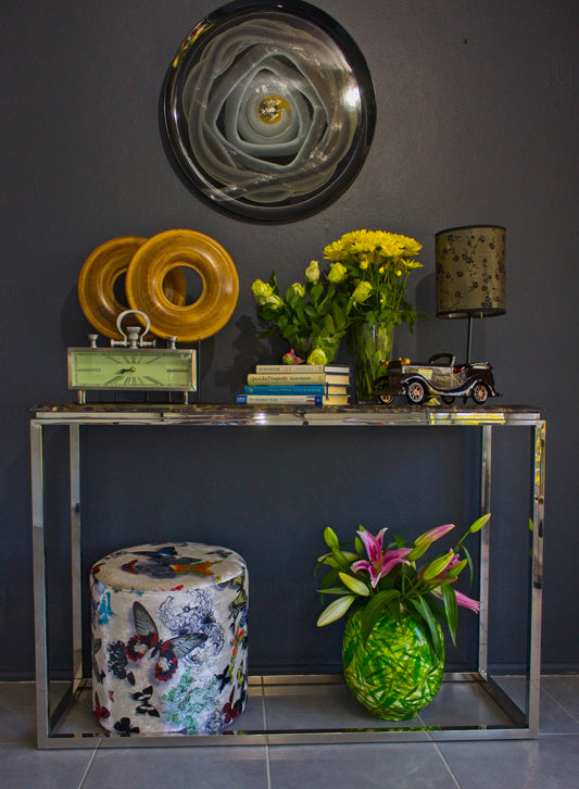 Rona Mirror Polished Stainless Steel Side Table with Clear Glass