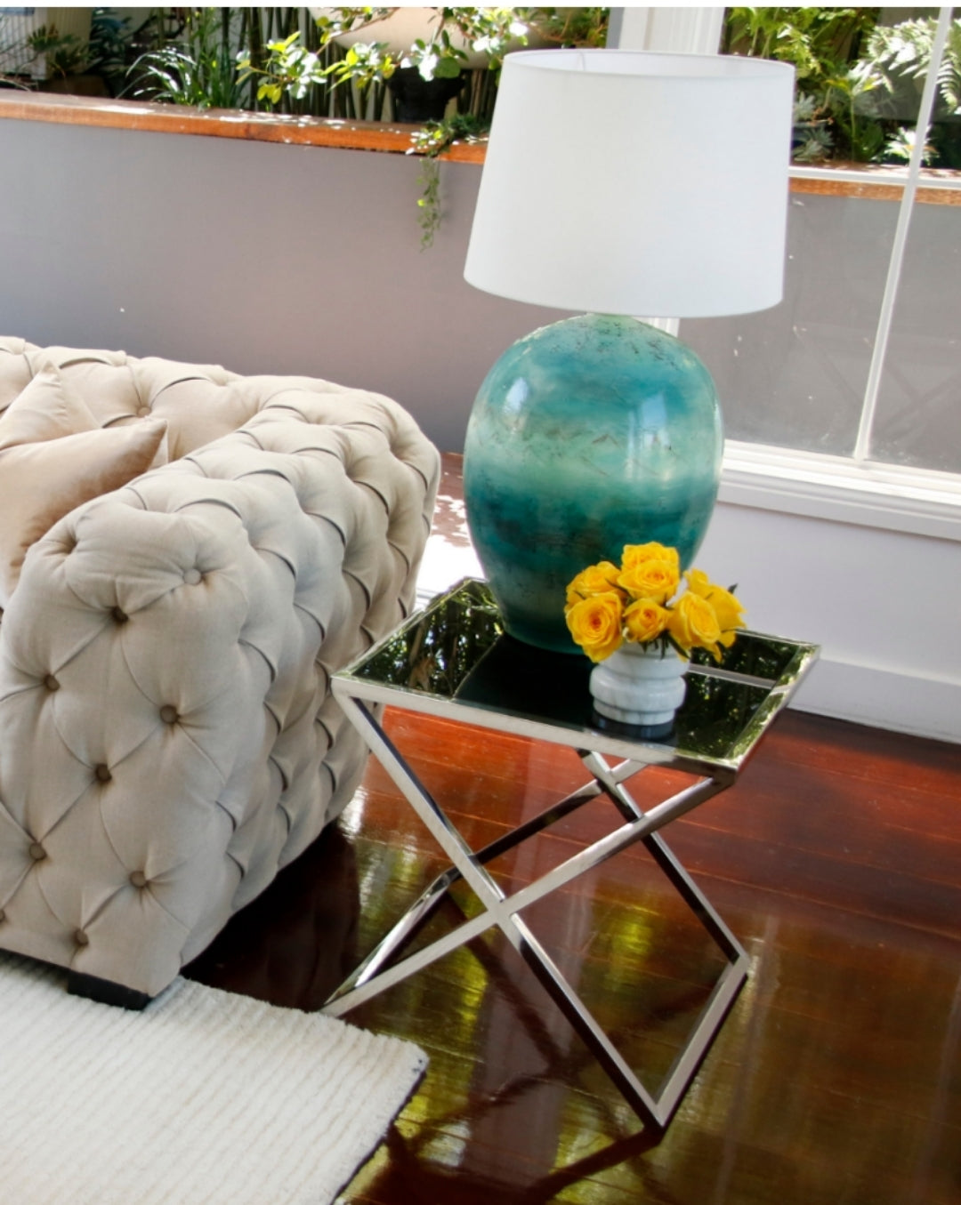Lily Mirror Polished Stainless Steel Side Table with Black Tempered Glass Top