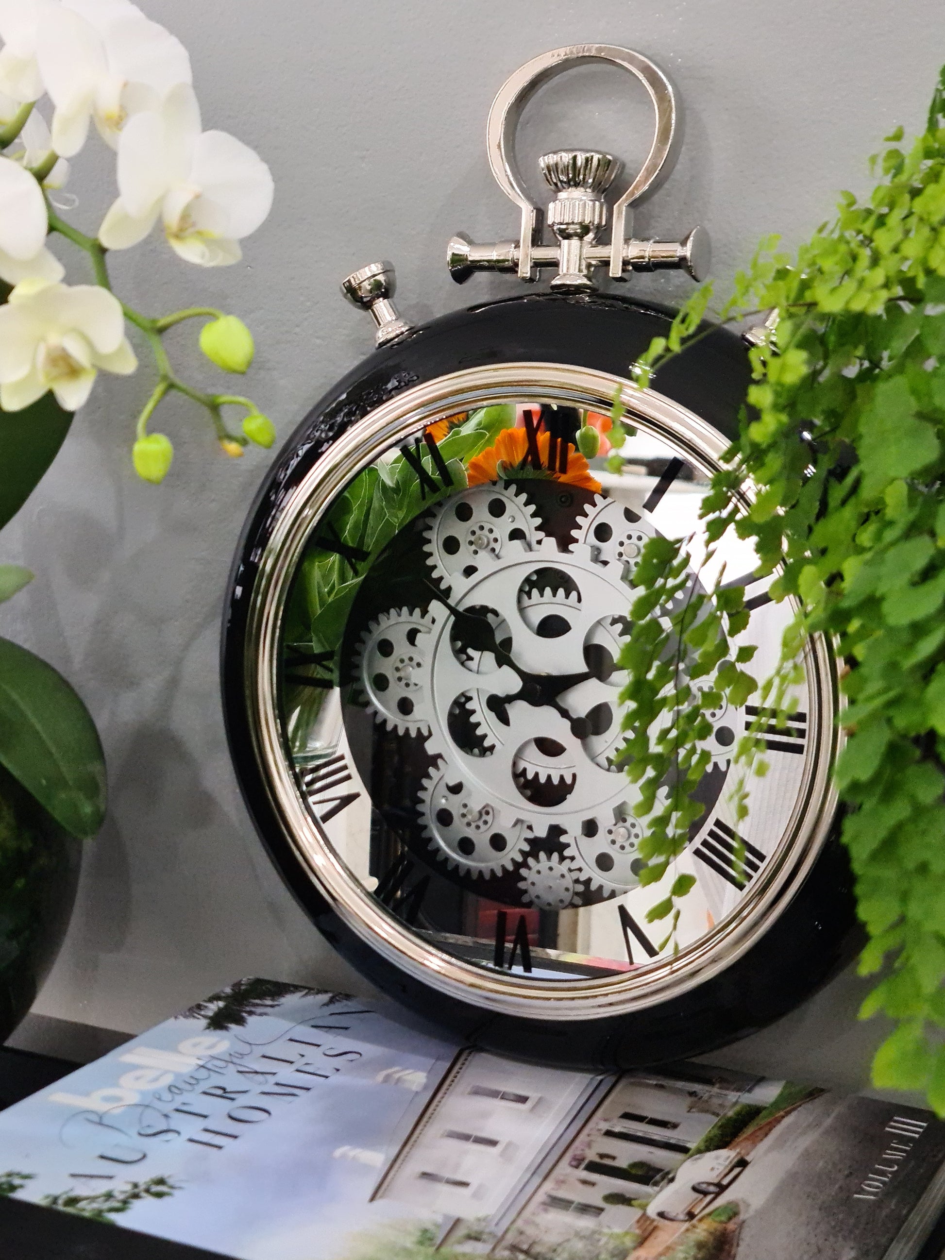 Roman Numeral 40 Cm Exposed Oval Gear Moving Mirror Clock